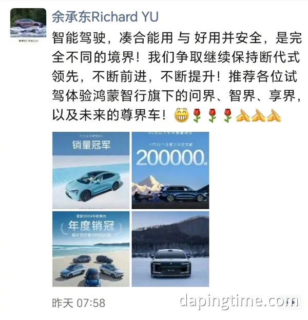 余承东在社交平台上分享了对智能驾驶技术的深刻见解,他提到:“智能驾驶,凑合能用与好用并安全,是完全不同的境界。”这一评论直接指向了某汽车厂商在智能驾驶领域的最新发布会。前一天晚上,这家国内汽车制造商召开了智驾发布会,宣布即将“开启全民智驾”。而余承东的言论被部分网友认为是对该厂商发布的智能驾驶技术提出质疑,掀起了两方粉丝及业内人士的激烈讨论,话题迅速登上热搜。